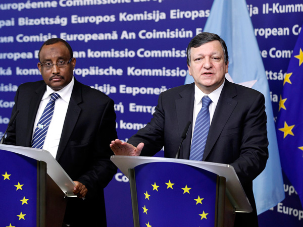 Somalia's Prime Minister Mohamed Ali Abdiweli (L) and European Commission President Jose Manuel Barroso hold a news conference after their meeting at the Commision's Headquarters in Brussels February 21, 2012. (REUTERS)