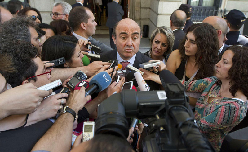 Spain's Economy Minister Luis de Guindos (centre) talks to reporters after leaving parliament in Madrid on Thursday June 14. (Reuters)