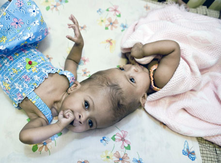 Undated handout photo released Sunday Sept.18, 2011 by British charity Facing the World of conjoined twins Rital and Ritag Gaboura (left to right not given) before they were successfully separated at London's Great Ormond Street Hospital for Children. Facing the World says Rital and Ritag Gaboura were born in Sudan with the tops of their heads stuck together. Twins born joined at the head _ known as craniopagus twins _ occur in about one in 2.5 million births and successful attempts to split them are rare. However, the condition can lead to serious medical problems and the charity said the twins' parents asked for help funding surgery to pull the two apart. The charity said Sunday the two were finally separated last month and appear to be healthy. (AP)