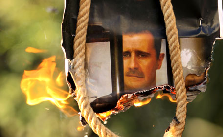 A makeshift gallows with a poster shows President Bashar al-Assad, during an anti-regime protest outside the Syrian embassy in the Cypriot capital Nicosia on July 31, 2011. Syrian forces killed nearly 140 people including 100 when the army stormed the flashpoint protest city of Hama to crush dissent on the eve of Ramadan, activists said. (AFP)
