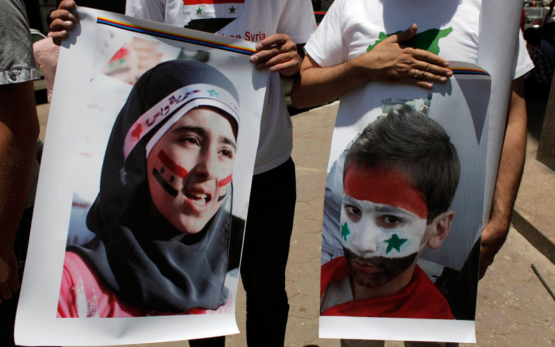 Two protesters carry posters with pictures of unidentified relatives in Syria, with the Syrian flag colors painted on their faces during an anti-Syrian regime rally. (AP)