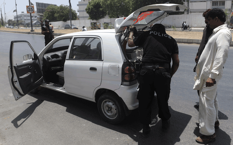 A Pakistani police commando searches a car near the US consulate in Karachi, after the death of Al-Qaeda leader Osama Bin Laden. Osama Bin Laden was killed in a highly sensitive intelligence operation in the suburbs of Abbottabad, 50 kms (30 miles) northwest of the Pakistani capital Islamabad, it was announced. (AFP)