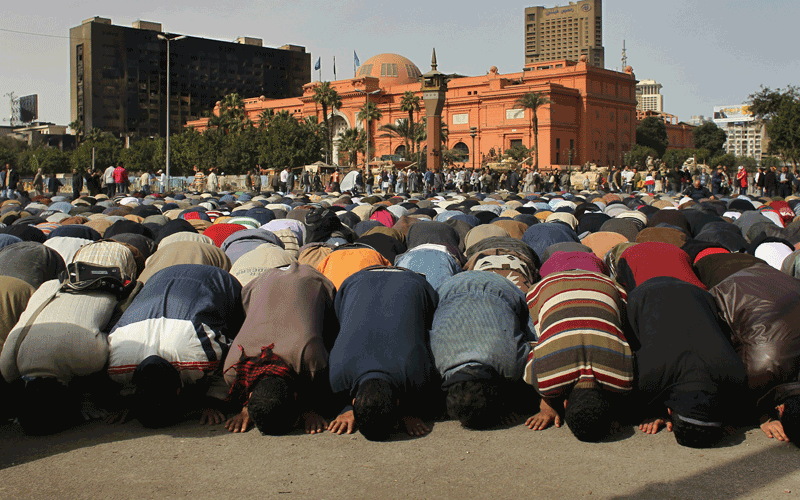 Anti-government demonstrators pray in front of the Museum of Egyptian Antiquities and the burnt ruling National Democratic Party headquarters in Cairo, Egypt. (GETTY IMAGES)