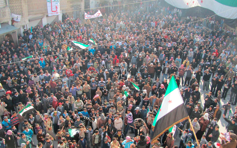 Demonstrators protesting against Syria's President Bashar al-Assad gather during a march through the streets in Ma'arrat al-Numan near Adlb. (REUTER)