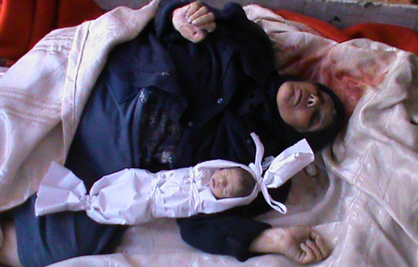 A handout picture released by the Syrian opposition's Shaam News Network on April 13, 2012 allegedly shows a woman who died along with her child as she gave birth under Syrian government shelling of the restive city of Homs in the recent past. (AFP)