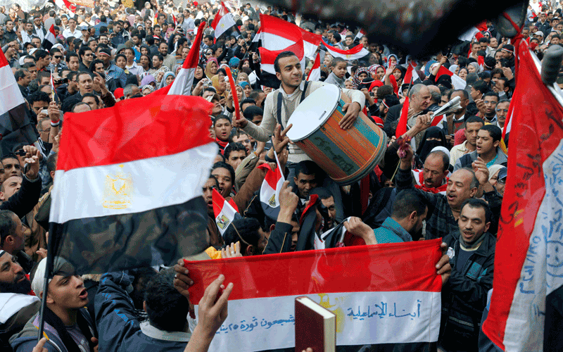 Egyptians dance and wave national flags in Tahrir Square in Cairo, Egypt. Egypt exploded with joy, tears, and relief after pro-democracy protesters brought down President Hosni Mubarak with a momentous march on his palaces and state TV. Mubarak, who until the end seemed unable to grasp the depth of resentment over his three decades of authoritarian rule, finally resigned Friday and handed power to the military. (AP)