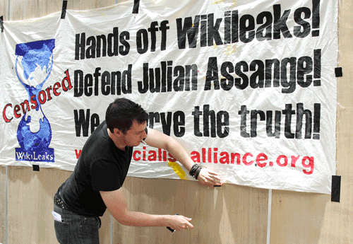 An unidentified protestor tapes a slogan to a wall before hundreds of protestors march through Brisbane's city centre to protest against the detention of WikiLeaks founder, Julian Assange, in Brisbane, Australia, Friday, Dec. 10, 2010. (AP)