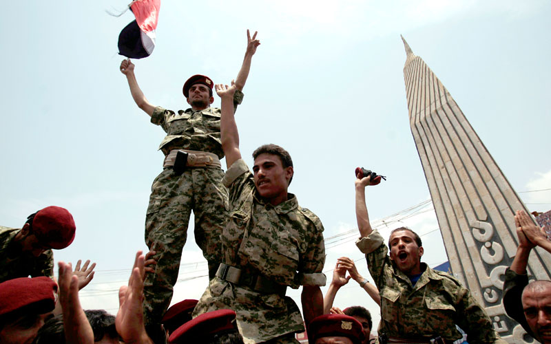 Defected soldiers salute during a protest demanding the resignation of Yemen's President Ali Abdullah Saleh in Sanaa, Yemen. (AP)