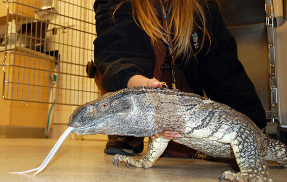 Black-throated Monitor lizards are carnivorous, legal to own in California and native to the African grasslands and parts of Asia. Juveniles go for about $100 in pet stores, but they grow.