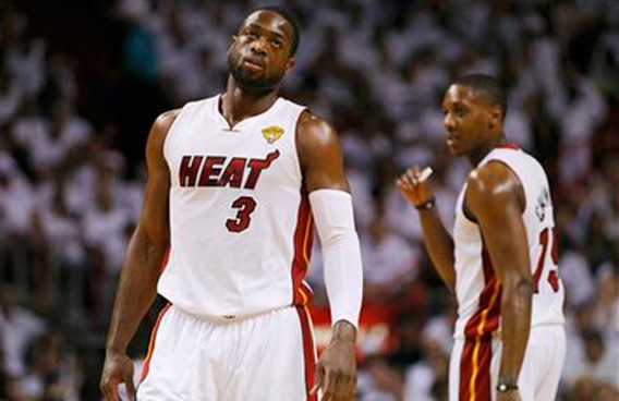 Miami Heat's Dwyane Wade (L) and Mario Chalmers pause during a break in play against the Dallas Mavericks during the first half in Game 6 of the NBA Finals basketball series in Miami. (REUTERS)