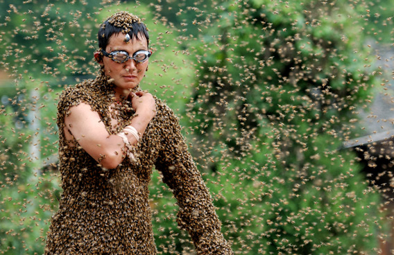 Bees cover beekeeper Wang Dalin during a 'bee bearding' contest in Shaoyang, Hunan Province of China. Wang Dalin won the contest against fellow beekeeper Lu Kongjiang after attracting 26.86kg of bees onto his body, covered only by a pair of shorts and swimming goggles. (GETTY/GALLO)