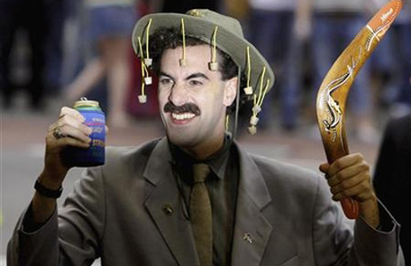 British actor Sacha Baron Cohen, in character as a Kazakh TV reporter known as 'Borat', holds a boomerang and can of beer in Sydney. (REUTERS)