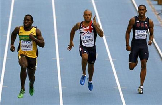 James Ellington of Britain (C) runs next to Nickel Ashmeade of Jamaica (L) and Jeremy Dodson of the U.S. (R) during their men's 200 metres heat at the IAAF World Athletics Championships in Daegu. (REUTERS)