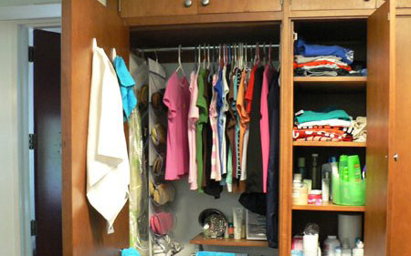 The student opened the closet door to find the man sitting on the floor in her clothing with a bag full of clothes, shoes and socks.