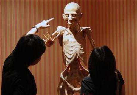 Visitors view an exhibit of a plastinated human body during an exhibition titled ''Myth of the Human Bodies'' in Manila. Real human body samples in the exhibition are made possible by plastination, a body-preservation technique developed by German anatomist Gunther von Hagens. (REUTERS)