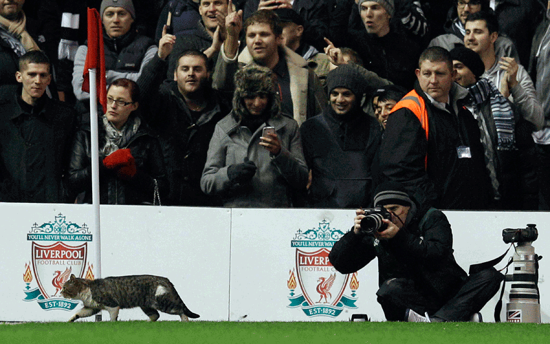 Liverpool fans chanted "A cat! A cat! A cat! A cat!" to the tune of team battle cry "Attack! Attack!" as the moggy ambled around.