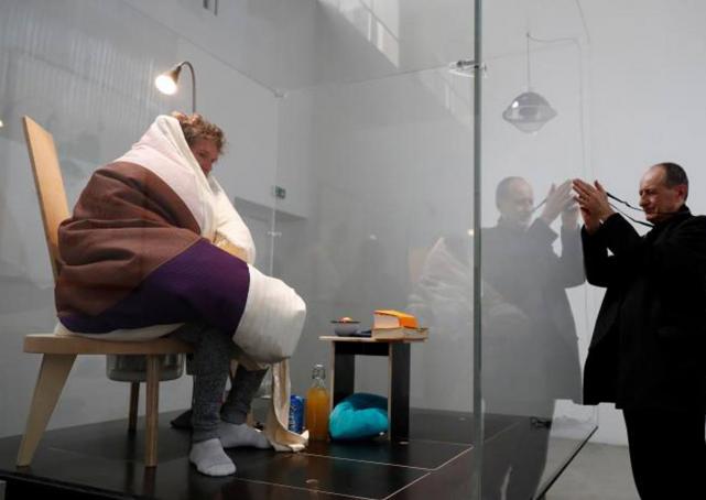 Poincheval embarked on his latest project in late March of imitating a mother hen by incubating some 10 eggs with his own body heat inside a glass vivarium at Paris' Palais de Tokyo contemporary art museum.