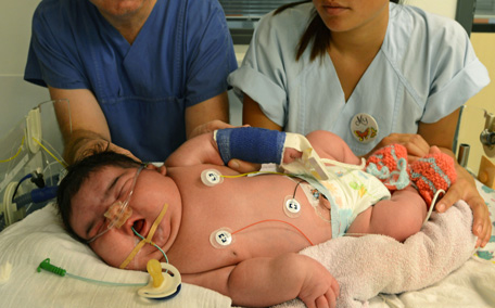 Consultant physician Matthias Knuepfer and nurse My take care of Germany's heaviest newborn until now at the neonatal intensive care ward of the University Hospital in Leipzig, Germany. Girl Jasleen was born four days ago weighing extraordinary 6,110 grams and measuring 57,5 cm in length. The mother only arrived at the hospital on the day of the birth and she suffers from an undiscovered gestational diabetes. (AP)