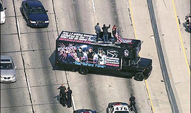 California Highway Patrol spokesman Rick Quintero says a big box van decorated with Imperial Stars' logo stopped on the southbound US 101 near Sunset Boulevard at about 10:30 a.m. Tuesday, blocking four of the five lanes. The driver took the keys and fled in another car, then three musicians climbed on top of the van and began to perform.