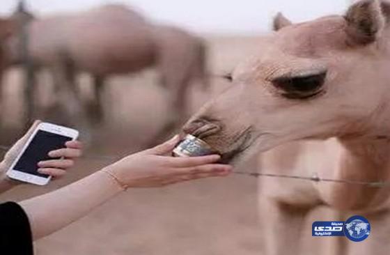 The picture showed only the woman’s hand carrying the cup and tilting it towards the camel’s mouth while she had a mobile phone in the other hand.