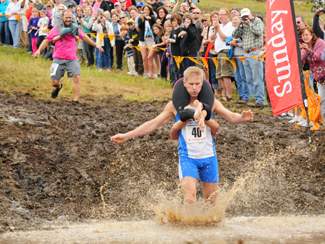 Taisto Miettinen and Kristina Haapanen traveled from Helsinki, Finland - where they won the World Wife Carrying Championship - for Saturday's contest. The Sun Journal reports that the couple finished with a time of 52.58 seconds on a course that includes hurdles, sand traps and a water hole.