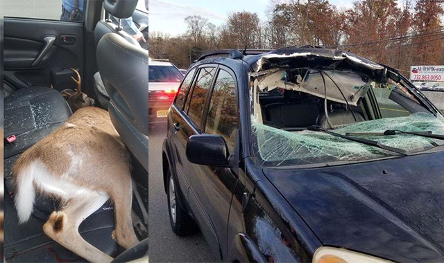 Misthal tried to avoid the deer, but couldn’t. Pictures posted on Facebook by police show the force of the impact sent the animal airborne and into her windshield. Its carcass came to a rest on the rear floor.