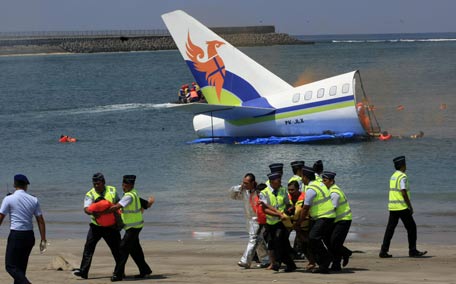 Mock victims are carried during an exercise of a rescue operation at Bali's International Ngurah Rai airport, Indonesia. (AP)