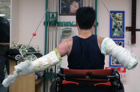 Huang Po-wei, an amputee who survived the 2015 New Taipei City water park explosion, working out during a rehabilitation session at a recovery centre in Taipei. (AFP)