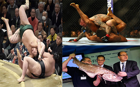 Sumo wrestler Sadanoumi, top, flips as he throws opponent Shodai outside the ring to win their bout in the New Year Grand Sumo Tournament at Ryogoku Kokugikan sumo arena in Tokyo. (AP)
