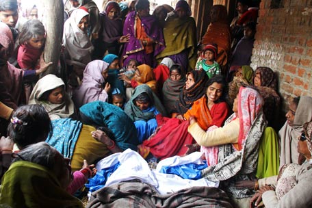 Indian relatives mourn over the bodies (bottom C) of two brothers who died after consuming bootleg liquor at Datli village in Malihabad, Indian's northern Uttar Pradesh state. (AFP)