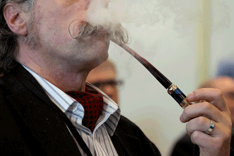 A delegate uses an e-pipe during "The E-Cigarette Summit" at the Royal Academy in central London on November 12, 2013. The merits of e-cigarettes were thrashed out at a one-day gathering of scientists, experts, policymakers and industry figures at the Royal Society in London. The use of electronic cigarettes -- pen-sized battery-powered devices that simulate smoking by heating and vaporising a liquid solution containing nicotine -- has grown rapidly. (AFP)