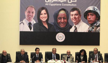 The banner was unfurled at a high-profile news conference on Sunday to promote the constitution. The Arabic text misspelt the word "Egyptians" as "determined" and Google image searches identified three of five people in the banner as foreigners.