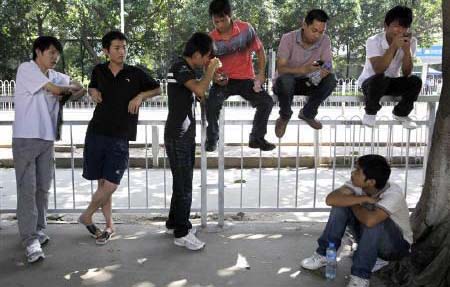 Job seekers wait for new job opportunities outside Foxconn's recruitment center in the township of Longhua, Guangdong province June 30, 2010. (REUTERS)