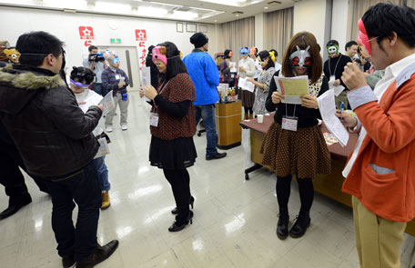 In a small town north of Tokyo, 15 men and an equal number of women donned plastic masks of Doraemon, Mickey Mouse and other fictional creations to try to find a date.
