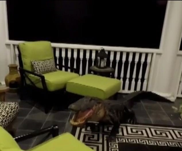 The family says the alligator climbed a back stairwell to the porch, crunched through the aluminum screen door and nestled between a sofa and a swinging bench.
