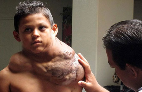Burdened by an abnormally large tumour growing on his neck, a 9 year old Mexican boy has been offered aid.
