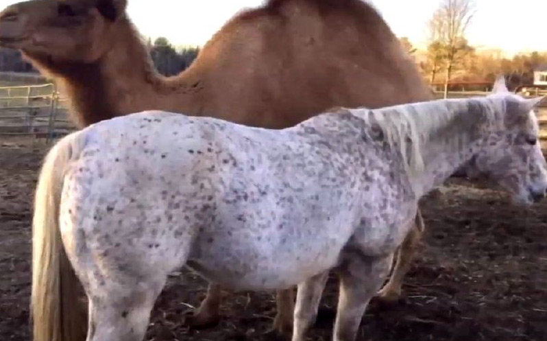 A horse and a camel at a Maine petting zoo have formed an unlikely friendship.
