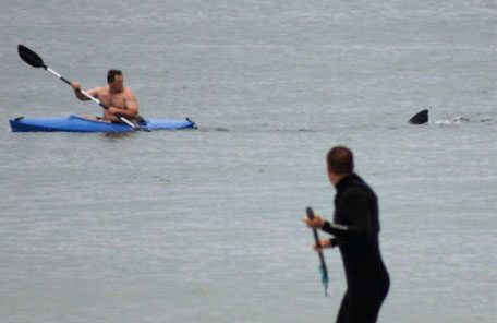 One photograph shows a shark's dorsal fin behind a man in a kayak while concerned people looked on.