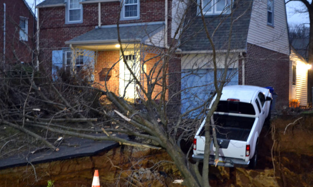 A tree could be seen teetering into the hole, but it also appeared to be keeping the pickup from rolling into the crater. The hole also swallowed part of the sidewalk and the edge of the street nearest the two homes whose yards are affected.