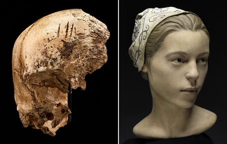 These handout images provided May 1, 2013 by the Smithsonian Institute in Washington, DC, shows four shallow chops (at top) to an incomplete skull (L) excavated at James Fort in Jamestown, Virginia, by William Kelso, chief archeologist at the Jamestown Rediscovery Project; and a forensic facial reconstruction (R) produced by StudioEIS of Brooklyn, New York in consultation with Smithsonian researchers based on human remains excavated in Jamestown. Early settlers resorted to cannibalism at Jamestown, the first permanent English settlement in America, researchers said May 1, 2013 after unveiling forensic analysis on the bones of a 14-year-old girl. Facing a period of starvation in the winter of 1609-1610 when about 80 percent of the colonists died, some apparently tried to dig into the brain of a child who had already died, said anthropologists at the Smithsonian National Museum of Natural History. The girl's skull showed signs of awkward attempts to extract the brain matter, said Douglas Owsley, the Smithsonian forensic anthropologist who analyzed the skull and tibia of the girl who came to Virginia from England. "The desperation and overwhelming circumstances faced by the James Fort colonists during the winter of 1609-1610 are reflected in the postmortem treatment of this girl's body," said Owsley.(AFP)