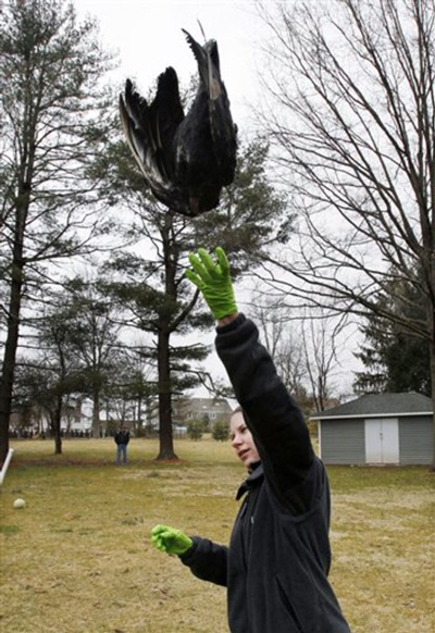 United States Department of Agriculture Wildlife Biologist Nicole Rein lifts a black vulture carcass in Bridgewater, NJ as it is hoisted up in a tree in a tried-and-true method of driving away flocks of damaging buzzards. (AP)