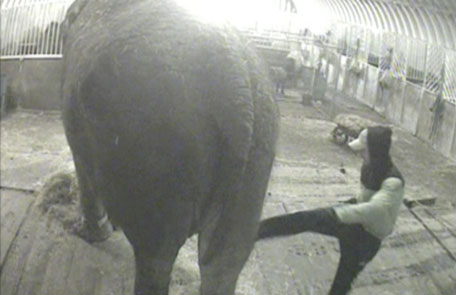 A groom hitting Annie the elephant in this undated handout photograph received from Animal Defenders International in London. (REUTERS)
