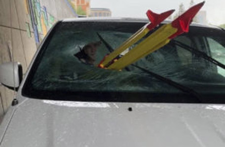 The driver of the van, Tim Page, tells KCRA-TV that he was on Interstate 5 Thursday morning when the yellow-and-red tripod smashed through the glass. He says it went through his passenger’s lung and popped out.
