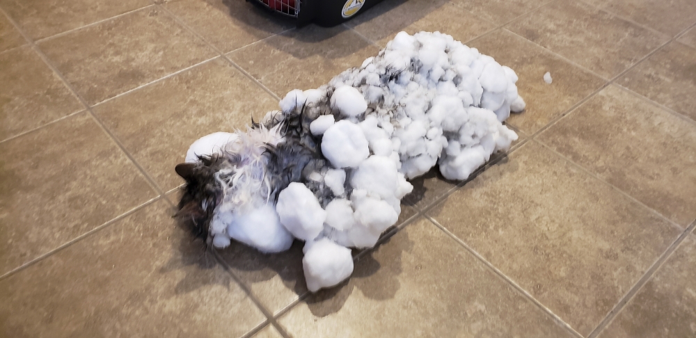 The owners of Fluffy said they came home to find their pet in a hard-packed snow bank, and it appeared that the animal had been sitting in one spot for a long time while the blowing snow drifted up around it.