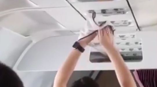 A woman was filmed attempting to dry a pair of underwear using the air vents while flying in a plane.