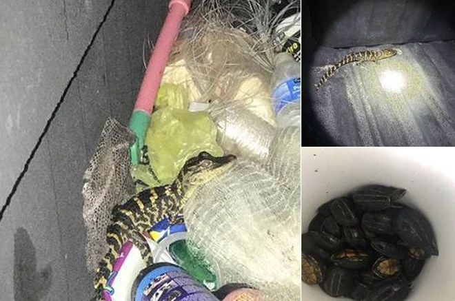 When the deputy found 41 3-stripe turtles in the woman’s backpack, he asked if she had anything else. She pulled the 1-foot (0.3-meter) gator from her yoga pants.