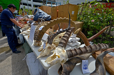 Thai custom officials display confiscated animal skulls and horns during a press conference at the customs offices in Bangkok. (AFP)