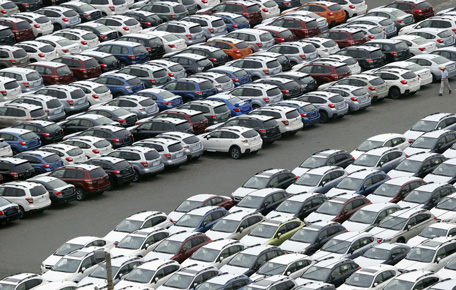 Cars for export park at a port in Kawasaki, southwest of Tokyo. (AP)