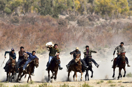 Participants ride horses as they fight for a slaughtered goat during a Buzkashi event in Yuli county, Xinjiang Uighur Autonomous Region. (REUTERS)