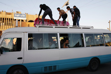 Residents prepare to transport the coffin of a victim who was killed in a bomb attack, during a funeral in Baghdad's Amil district. A suicide bomber driving a minibus blew himself up outside a cafe in a mainly Shi'ite Muslim district of the Iraqi capital on Sunday, killing at least 38 people, police and medics said. (REUTERS)